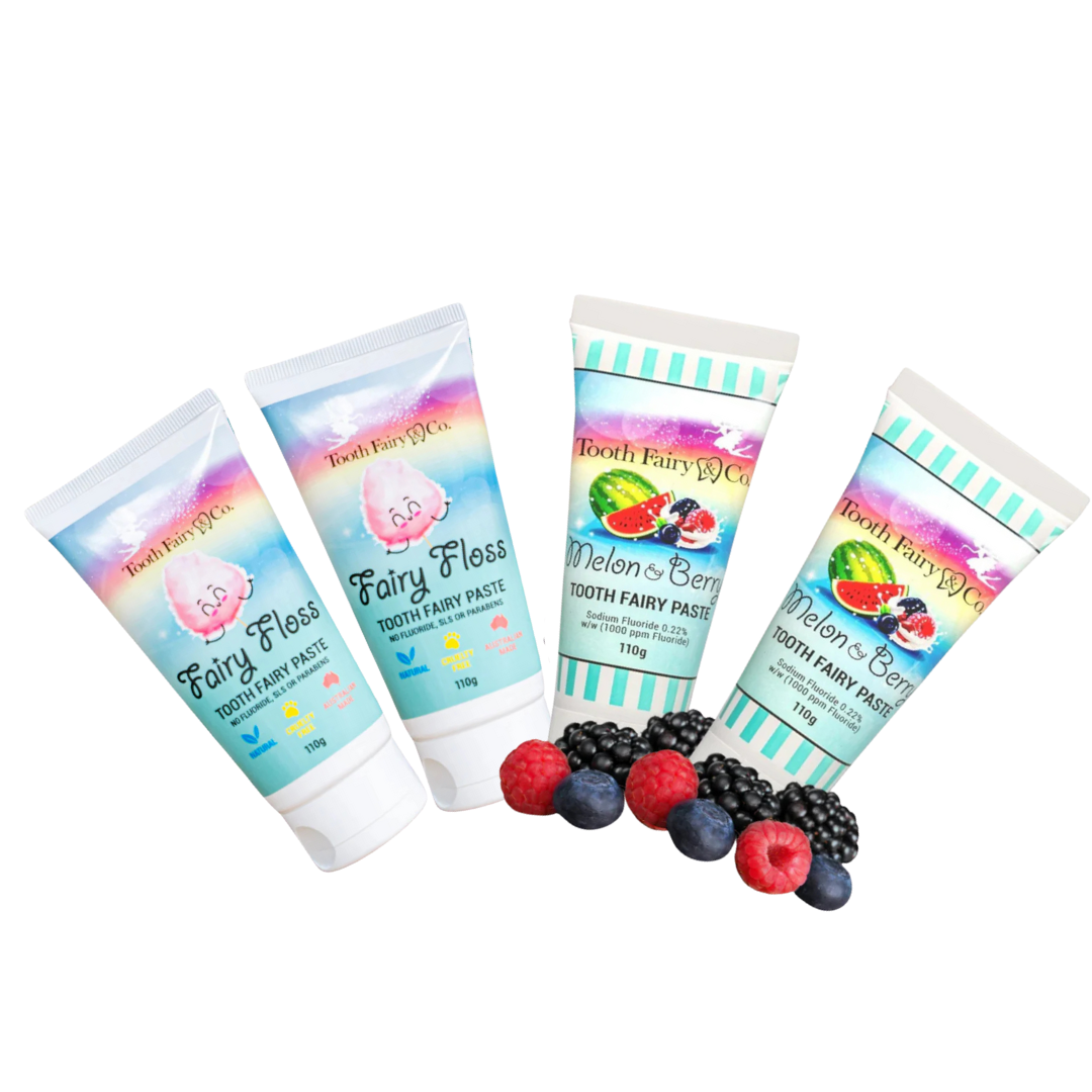 The Family Favourite's Bundle includes 2 tubes of each Tooth Fairy Paste flavour – one for every member of the family (and a few extras for good measure!).